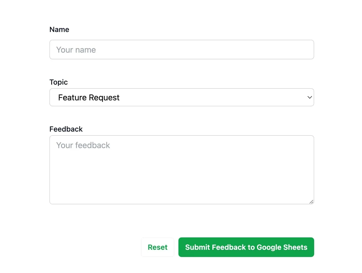 Google Sheetsâ„¢ is an excellent tool for quickly storing information. It is particularly useful for collecting user feedback, like tickets, issues, or even feature requests, without requiring a traditional database like PostgreSQL or MySQL.