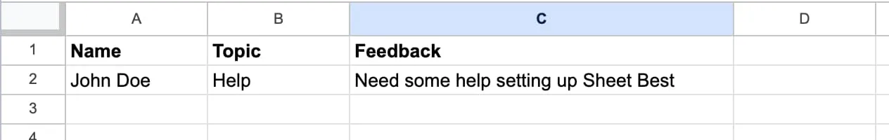 Now, let’s create a simple HTML form that submits data to Google Sheets using Sheet Best. Let’s set up a basic form that has a field for each column in the sheet: