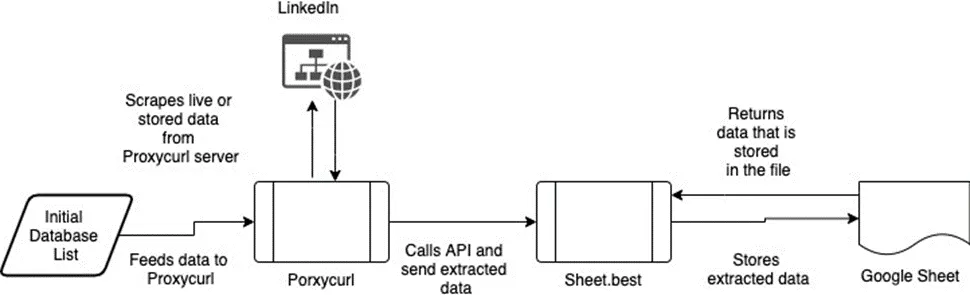 Sheet Best - The API service that acts as the middleman. Who saves the data you had gathered from ProxyCurl into a Google sheet.