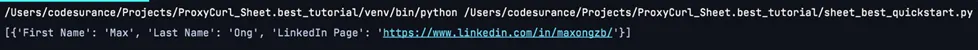 get_linkedin_url- Requires a LinkedIn profile URL as a parameter. Pulls the LinkedIn data from the LinkedIn Person Profile Endpoint endpoint and returns the data as a JSON data type.save_linkedin_data- Requires the Linkedin data and position of the Google sheet that you want to update. This function will initiate a PUT request to save the LinkedIn data into the Google Sheet by using the Sheet Best connection url.display_google_sheet_data- Retrieves the data from Google Sheet using the Sheet Best connection url and displays it in the console.